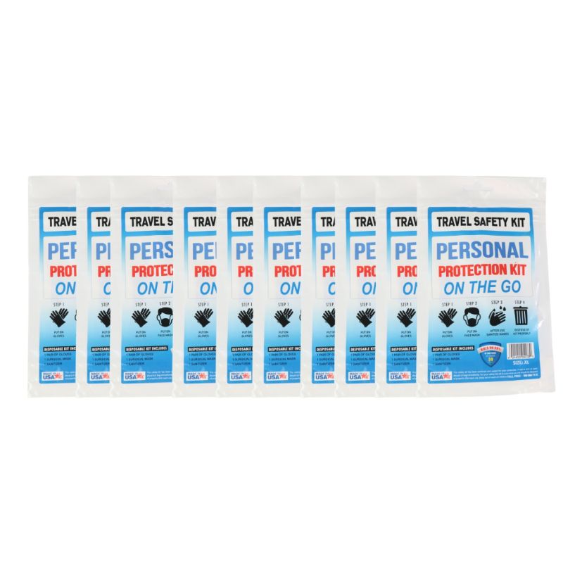 10 PACKS OF TRAVEL SAFETY KITS EACH BAG CONTAINS 1 PAIR OF GLOVES 1 MASK AND 1 SANITIZER NEW IN PACKAGE $17.98