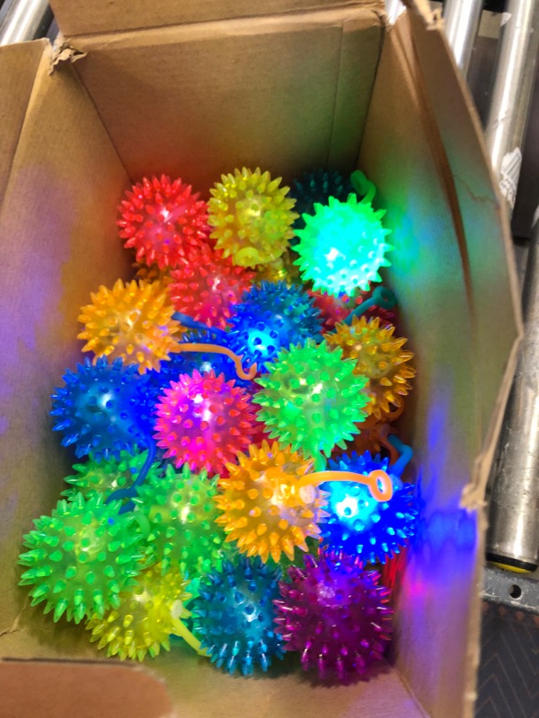 100 Bulk LED Fidget Spiky Ball Light Up Spiky Bouncy Ball Flashing Squeaky Ball Blinking Sensory Toy Multicolor Puffer Balls Stress Relief Balls Rubber Toy for Pet Dog Cat Kids, Teens, Adults - missing some