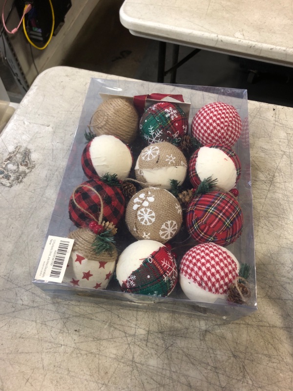 12 Pcs Burlap Christmas Ball Ornaments, 3.15 Inches Rustic Buffalo Plaid Christmas Tree Ornaments, Natural Jute Farmhouse Decorations for Xmas Tree, Holiday, Party