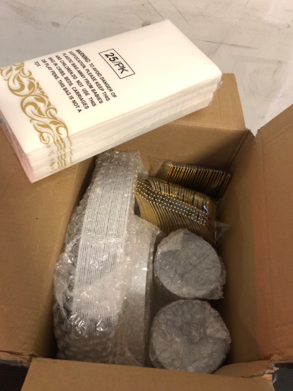 175 Piece Gold Dinnerware Set 25 Guest-50 Gold Grid Plastic Plates-25 Gold Plastic Silverware-25 Gold Plastic Cups-25 Linen Like Gold Paper Napkins