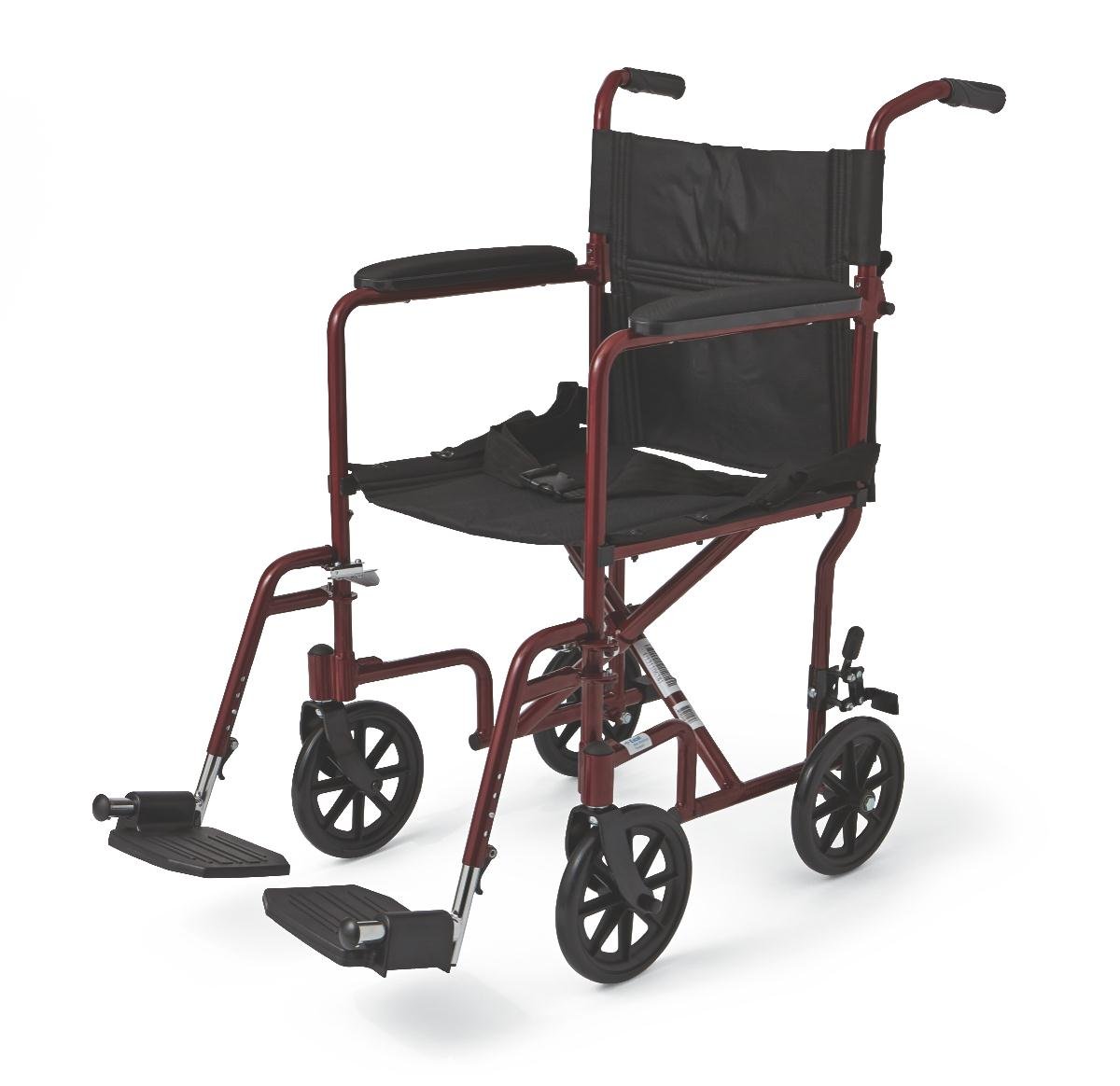 The Aluminum Transport Chair has a lightweight yet durable powder-coated aluminum frame plus fold-down back with storage space, making it great for on-the-go use. Includes easy-clean nylon upholstery, comfortable padded arms, and handbreaks with seat belt for safety. The red transport chair also features permanent full-length arms plus removable swing-away footrests for easier in/out. Weighs only 19 lbs, it has 8" front and rear wheels for easy maneuverability with 300 lbs weight capacity.
