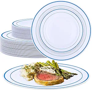 50 Pcs Plastic Plates Disposable Dinnerware Set 25 Guests Heavy Duty Disposable Plates with Rim 10.25 and 7.5 In Plastic Dinner Plates for Party Wedding Graduation Events (Blue Rim)