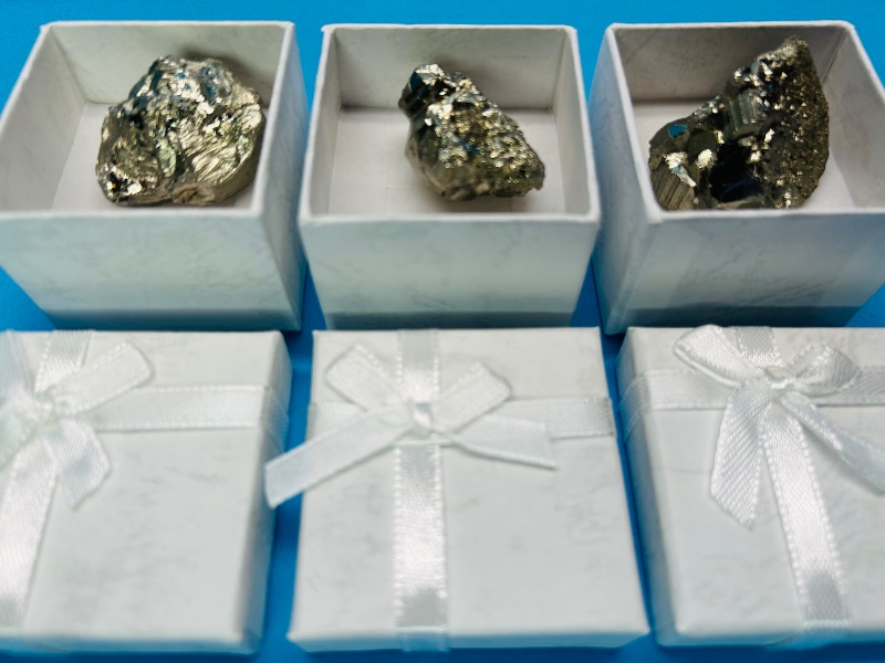 687037… 3 pyrite (fools gold) nuggets in gift boxes