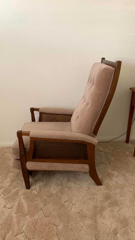 FABRIC AND WOOD RECLINER CHAIR 25” X 34” H 31”