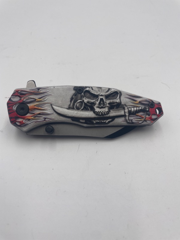 GREY PIRATE WITH FLAMES AND SWORD POCKET KNIFE NEW