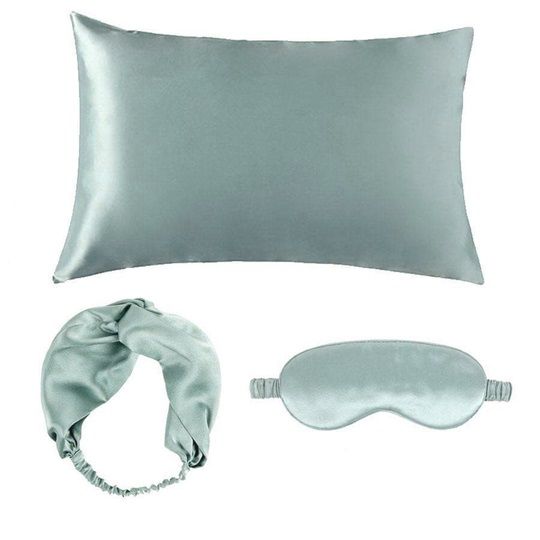 LUXURY SATIN KIT ALLOWS YOU TO GET YOUR BEAUTY SLEEP WITH 1 PILLOWCASE 1 SLEEP MASK 1 HEADBAND MADE OF PREMIUM SATIN MATERIAL COLOR SAGE NEW IN CASE $99