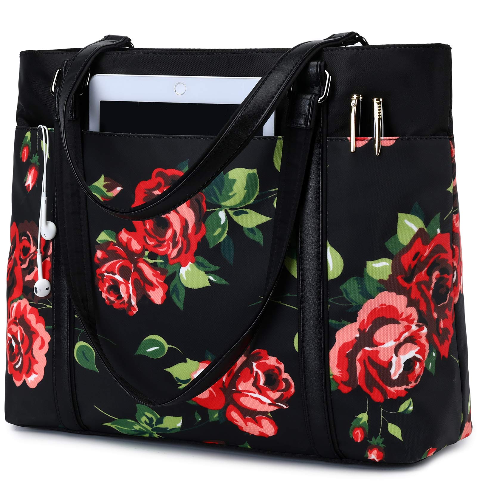 Laptop Tote Bag Womens Work Bags Purse Floral Teacher Handbag Shoulder Bag fit 15.6 in laptop (Black - Rose)