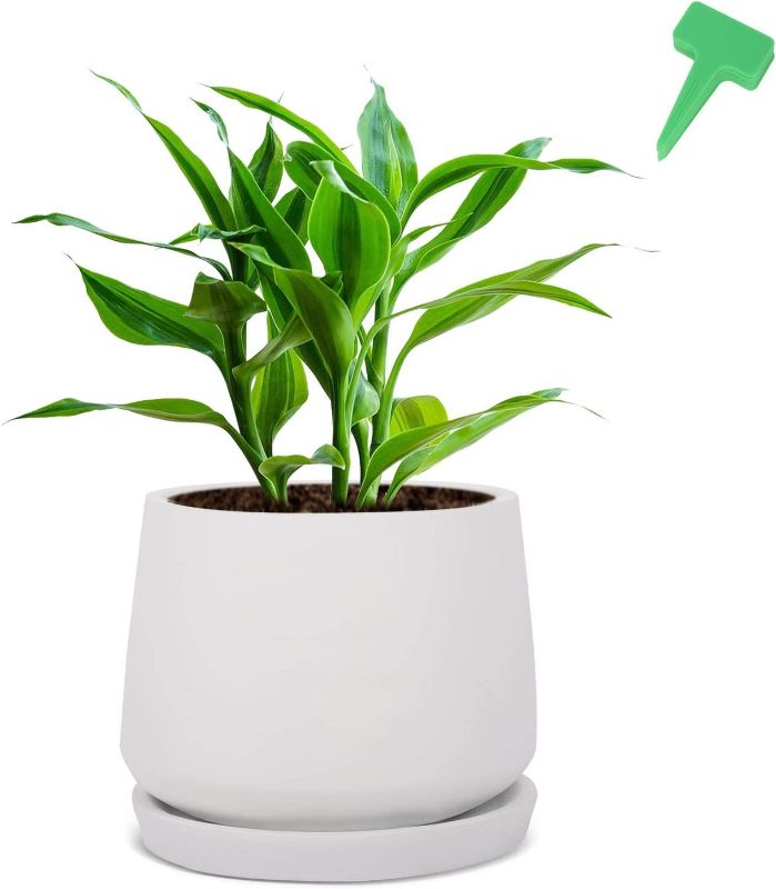 ***NO BOTTOM***CEED4U 5.9 Inches White Cement Plant Pot Flower Planter with 15 Packs Plant Labels Drainage Hole and Saucer, Medium Indoor Home Décor Pot Plant Container for Aloe Plants Flower, Plants Not Included