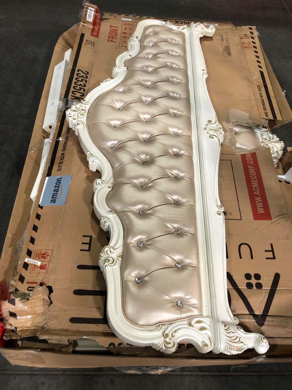(***TRUCK OR TRAILER PICK UP ONLY***) (UNKNOWN IF MISSING PARTS) Acme Gorsedd Tufted Queen Panel Bed in Cream Fabric and Golden Ivory