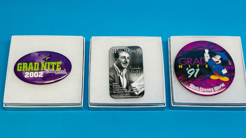 152344… 3 Disney button pins in gift boxes